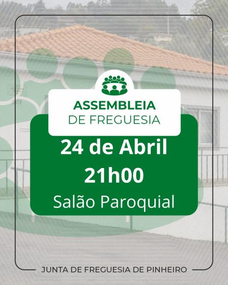 Realiza-se no dia 24 de abril mais uma sessão oridnária da Assembleia de Freguesia de Pinheiro. A reunião decorre no Salão Paroquial com início às 21:00 horas. É a seguinte a ordem de trabalhos:1- Período antes da ordem do dia;2- Informações da Junta de Freguesia;3- Aprovação da ata da Assembleia anterior;4- Apreciação e votação dos documentos de prestação de contas do ano anterior;5- Apreciação do inventário dos bens, direitos e obrigações patrimoniais;6- Abate de Inventário – Deliberação sobre o abate dos bens móveis;7- Proposta Gestão de Espaços Verdes - Delegação de Competências: Manutenção corrente dos espaços verdes;8- Aprovação de Modificação ao Orçamento do ano de 2026;9- Aprovação do Regulamento de Apoio a Coletividades;10- Aprovação do Regulamento de Apoio à Natalidade;11- Período pós ordem do dia e de intervenção do público.A sessão é aberta a todos os cidadãos.